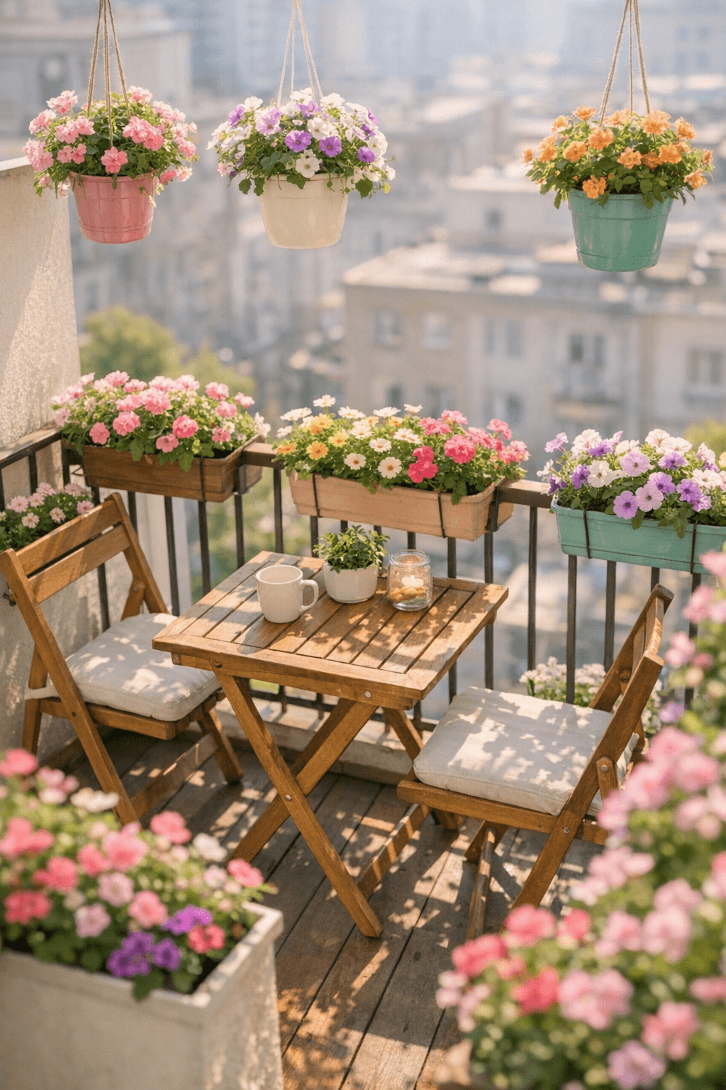Rozwinięcie: Dobrym wyborem są surfinias, pelargonie, zioła jak mięta czy bazylia. Wiszące donice i kwiaty pnące maksymalizują przestrzeń.